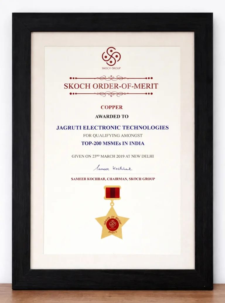 Jagruti Electronic Technologies has been honored with the SKOCH Order of Merit for ranking among the Top 200 MSMEs in India, reflecting our commitment to quality, reliability, and innovation in electronics distribution.